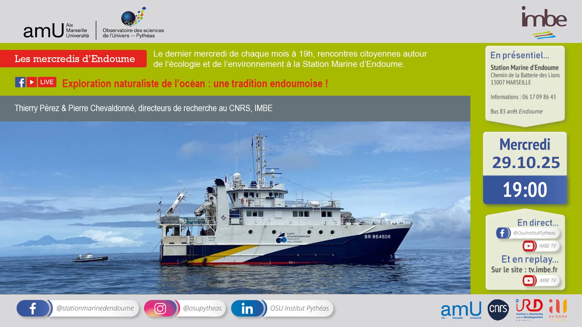 Endoume Marine Station Rue de la Batterie des Lions Conference room Batiment IV, Marseille, FranceAs part of the Endoume Wednesdays public lectures series, Thierry Pérez and Pierre Chevaldonné, CNRS Research Directors at IMBE, will be giving a lecture entitled “Naturalistic ocean exploration: an Endoumois tradition“, either in person at the Endoume Marine Station or live. Summary of the lecture: For several decades now, [...]