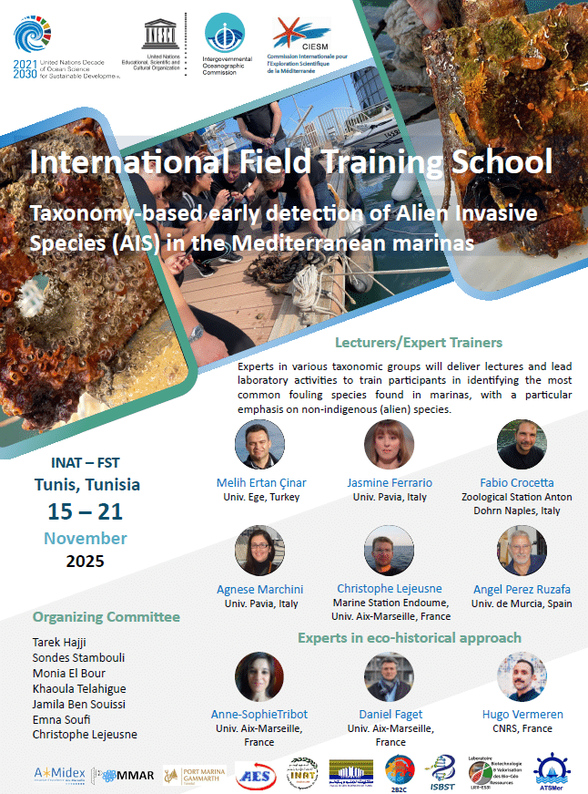 L’école internationale de terrain sur les espèces exotiques portuaires se tiendra du 15 au 21 novembre 2025 en Tunisie, conjointement organisée par le programme Amidex Interdisciplinarité POMMAR (coordination : C. Lejeusne) et l’Institut National Agronomique de Tunisie (INAT).